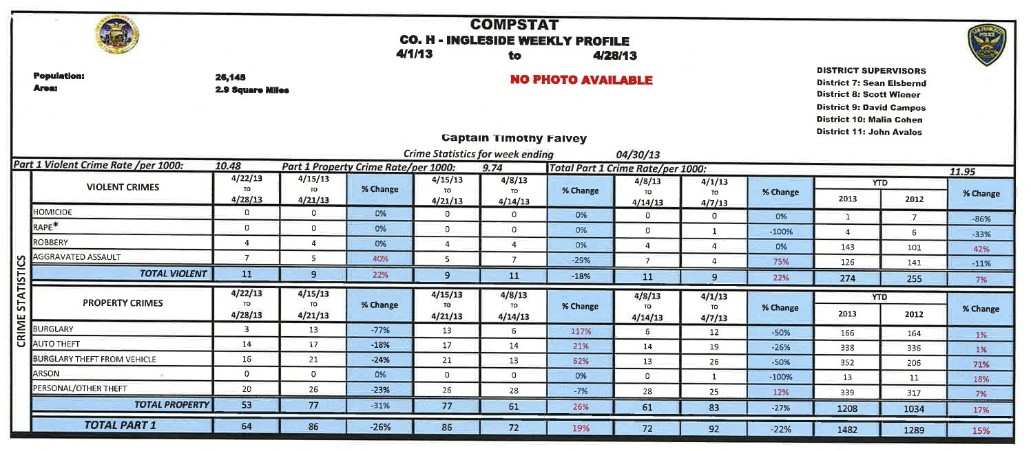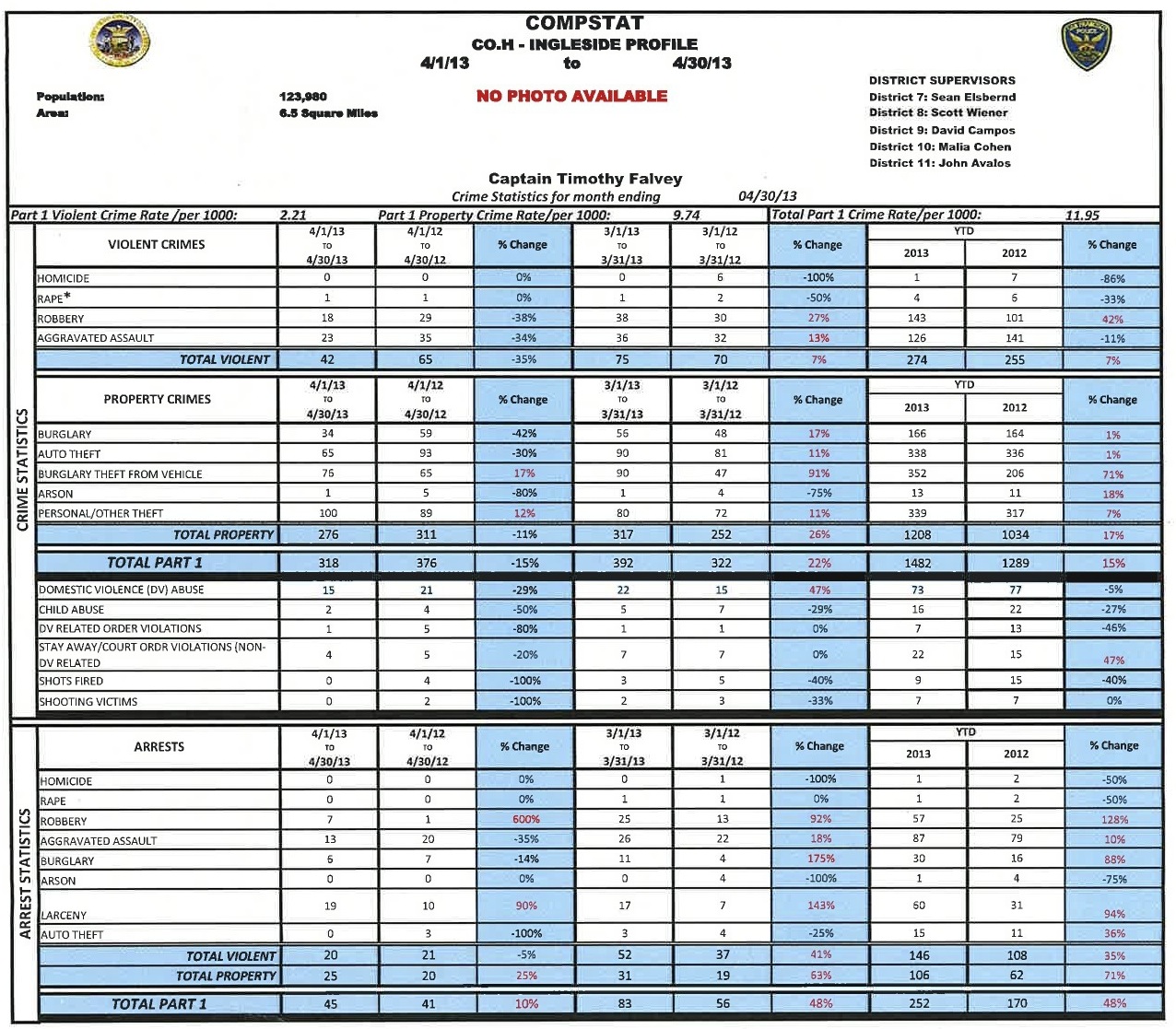 Ever-vigilant, Neighbor Sarah attended the SFPD Ingleside Station Community Meeting on May 21. Afterward, she typed up these fantastic summary notes for the rest of us. Lots of very interesting crime statistics and data this month, so read on and be wiser: