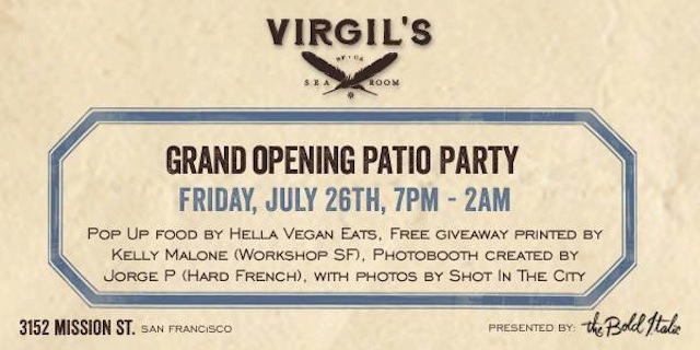 I wanted to be sure that you had all of the information about the Grand Opening Patio Party we are hosting at Virgil’s Sea Room on Friday evening July 26 from 7pm-close. Our gorgeous patio is ready for your outdoor drinking pleasure so come celebrate under the stars with us. We are pulling out all the stops to welcome you into our new backyard with a tasty pop up food vendor, photobooth, free giveaways and more at our patio opening party presented by The Bold Italic.