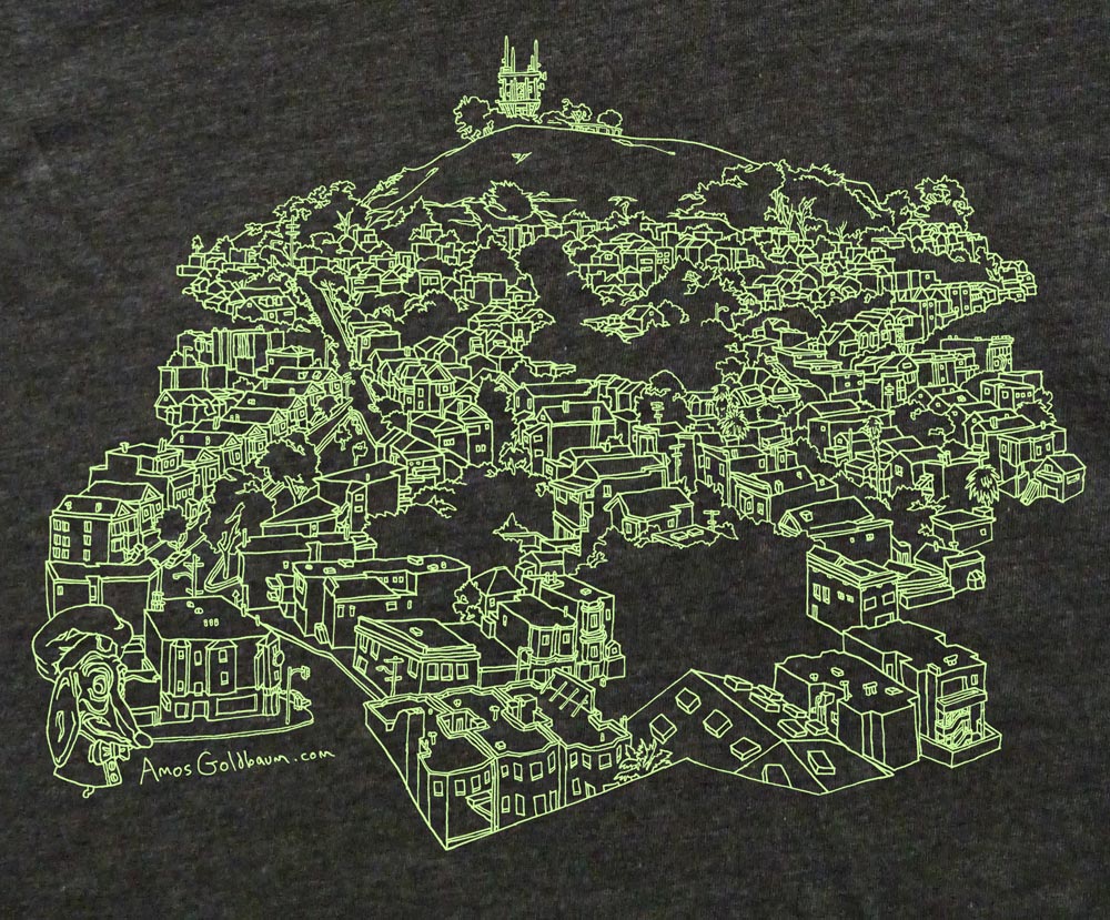I’ve wanted to do a Bernal shirt for a while, but couldn’t find the right angle. Finally I found an awesome view that showed the contour of the hill as well as the complexity of the streets traversing it. I wanted to include the Doggie Diner that used to be on Mission and (then) Army but the only picture I could find was the wrong angle. In the end, I drew the Doggie Diner head as a sort of apparition, just hanging out on Mission St.