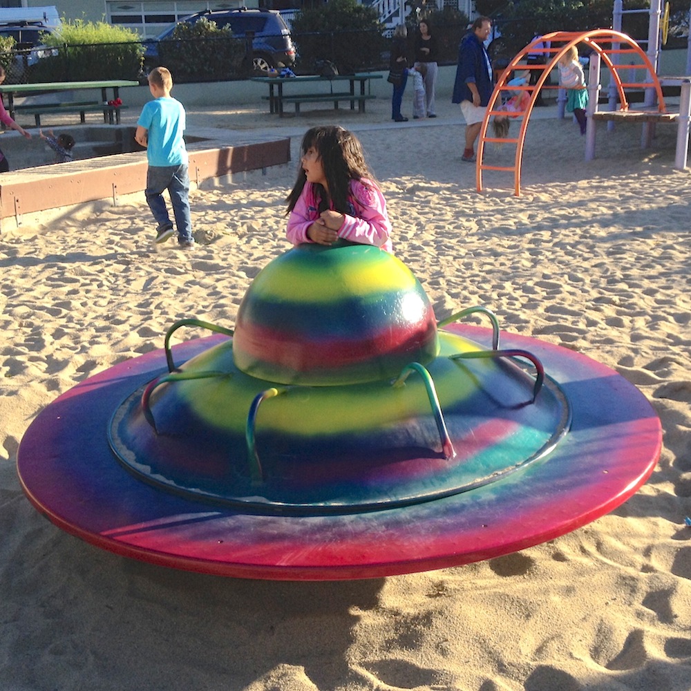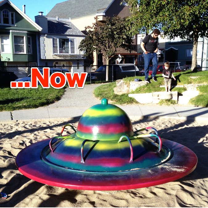 There are amazing folks at Park and Rec that understand the value of keeping this piece of Bernal History spinning for the ages. I recently returned to my childhood town in New Hampshire to find that evil bureaucrats insisted that the town remove and destroy perfectly good pieces of playground equipment including a satellites dinner that not only had I grown up with but my mom. They also destroyed a really tall freestanding metal slide of similar age for the sole reason that it was too tall to be considered safe. I was heartbroken and no longer believe the “live free or die” emblazoned on the license plates.