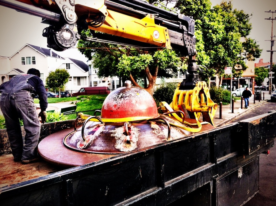 Luckily, Neighbor Demece, Lead Warrior Princess of Precita Valley Neighbors, was on the case. Through her contacts deep inside the Recreation and Park bureaucracy, Neighbor Demece determined that the beloved satellite spinner was receiving a complete refit in preparation for a return to service.