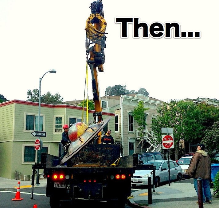 Fortunately, an emergency effort was undertaken to repair the satellite spinner and return it to service. This required the complete removal of the iconic spinner hull, however, which was upsetting to many Bernal Heights observers. Bad enough that the spinner was broken; Scenes of the spinner resting pathetically on the back of a crane truck were heartbreaking.