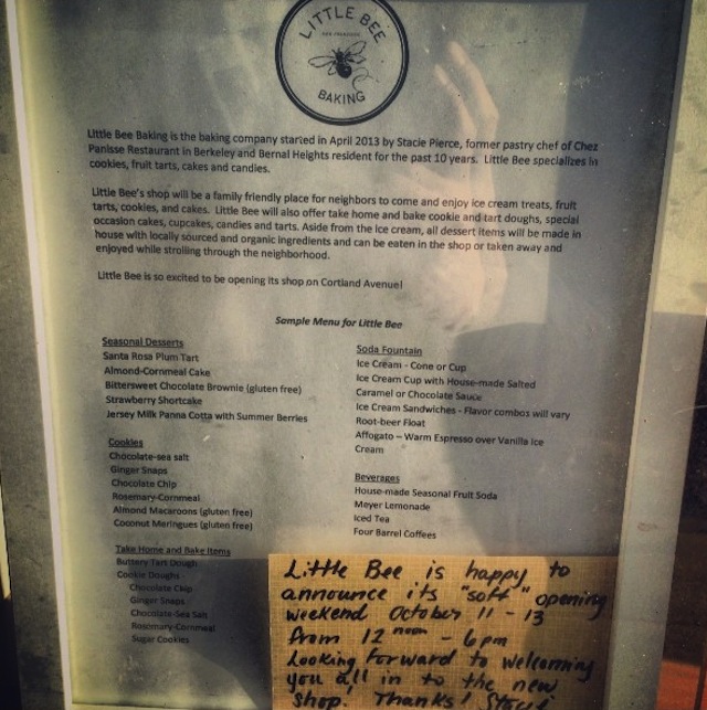 According to the sign in the window, the new Little Bee Bakery from Bernal neighbor (and Chez Panisse alum) Stacie Pierce is set to open for a soft-launch starting today in the former Rock Candy Shop space at 521 Cortland.