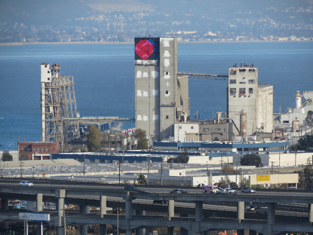 Case in point: There’s a new mural emerging on the horizon to the east of Bernal Hill. It’s taking shape on the side of that giant, derelict grain silo near the bay, and as you can see above, Bernalwood contributor Joe Thomas has been tracking its progress from his high-altitude observation post on Bernal’s east slope.