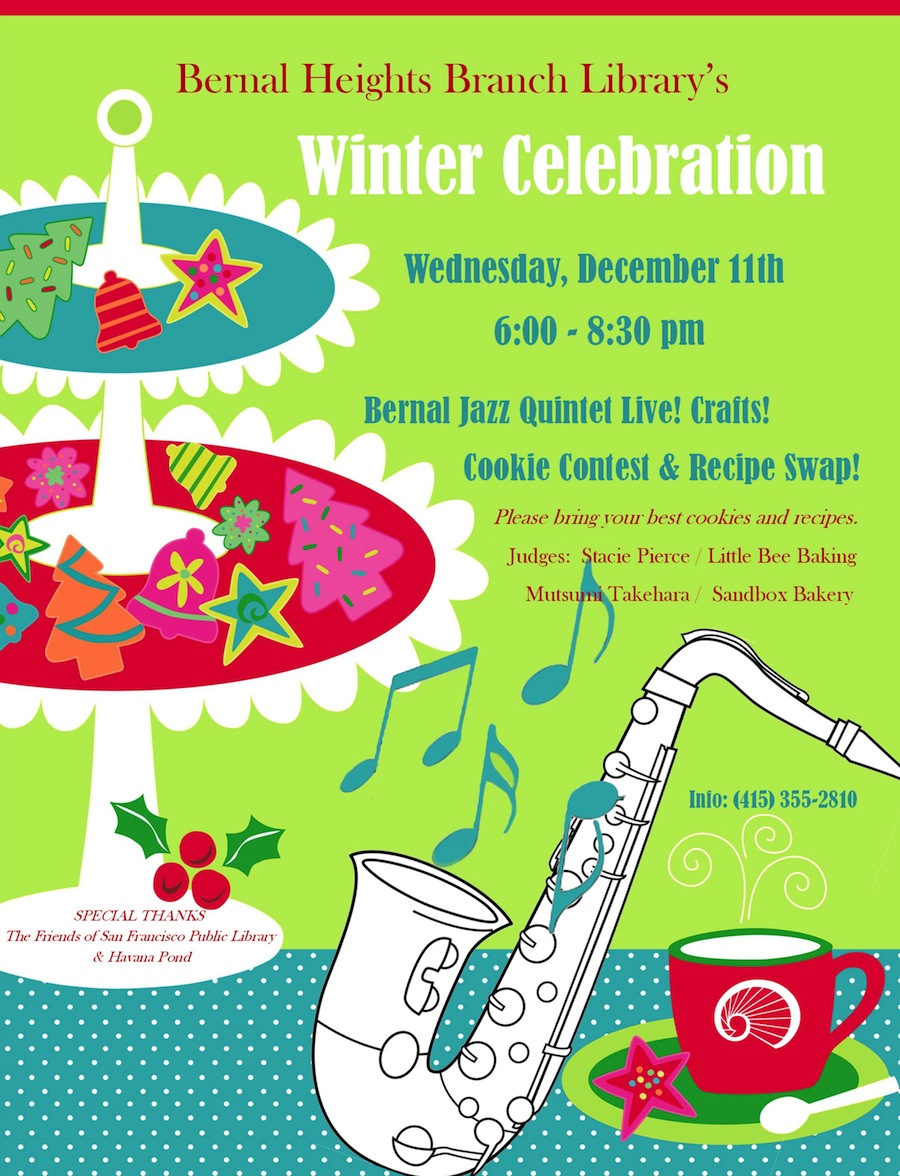 Please join us for our annual celebration. The evening features the awesome Bernal Jazz Quartet playing seasonal selections, holiday craft making in the children’s room AND this year, our first COOKIE CONTEST & RECIPE SWAP! Celebrity judges are our own Stacie Pierce (Little Bee Baking) and Mutsumi Takehara (Sandbox Bakery.) Bring your favorite cookies with recipe, and maybe YOU will get a blue ribbon!