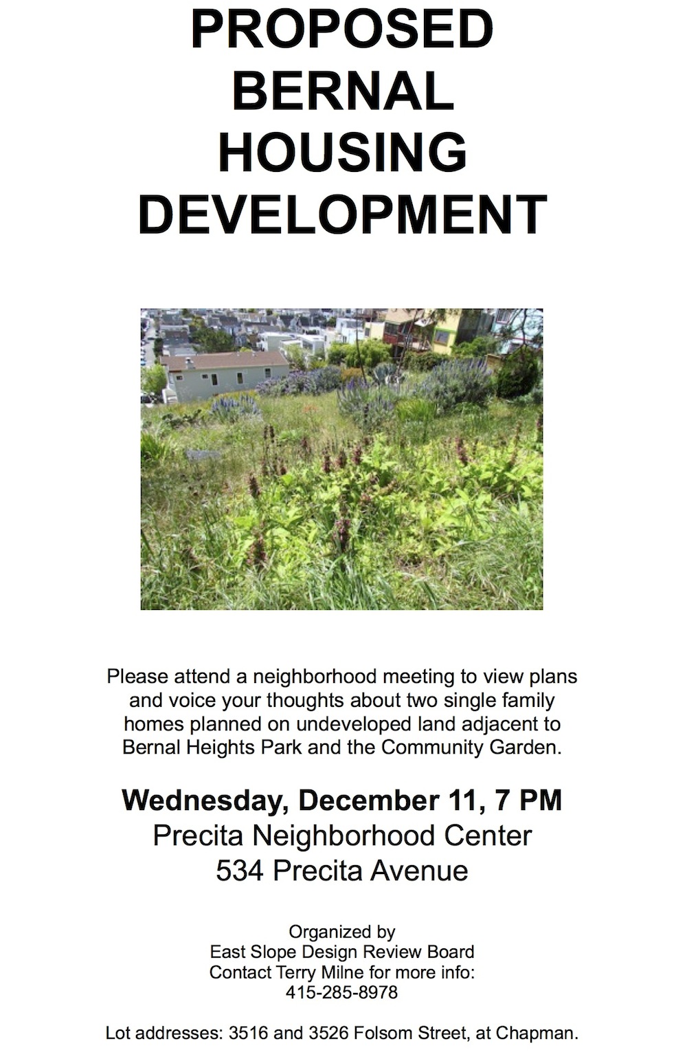 Neighbor Alicia is spreading the word about a community meeting that will happen tomorrow, Wesdnesday December 11 at 7 pm at the Precita Neighborhood Center, to review a proposal to build two single-family homes on a patch of undeveloped land on Folsom near Chapman, on the south side of the hill just below Bernal Heights Blvd.