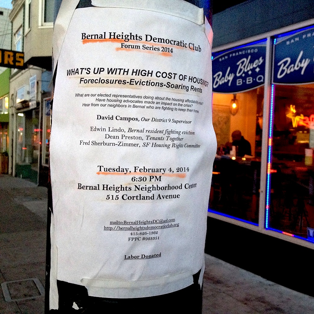 Also, a piece of paper we found taped to a pole told us D9 Supervisor David Campos will speak at a housing forum tonight, 6:30 pm at BHNC on Cortland.