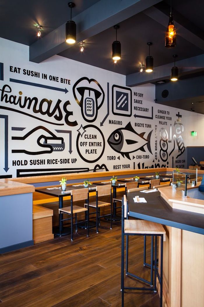 Your Bernalwood editor visited Chef Tim at the new location a few weeks ago, as he was deep in the final stages of Construction Mode. Ichi 2.0 looks terrific, with a smart design that divides the restaurant’s generous floorplan into a series of smaller, more intimate spaces, and a bold mural/etiquette guide dominating the south wall: