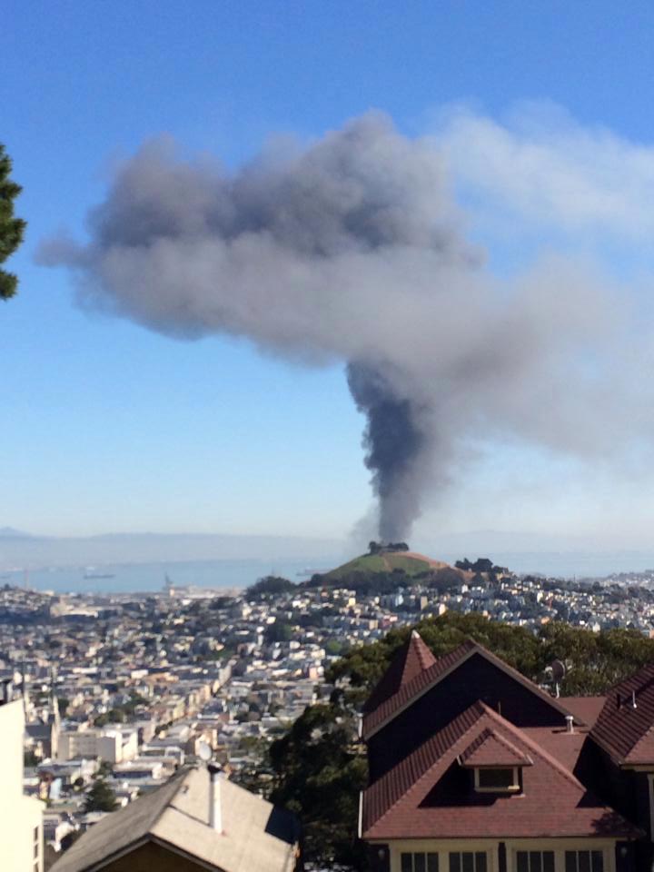 Neighbor Brandon made a comment about yesterday’s big industrial fire in Bayshore, to the effect that from the western side of Bernal Hill, the smoke from the blaze made it look like a volcano had erupted at the peak of Bernal Hill.