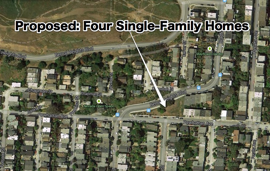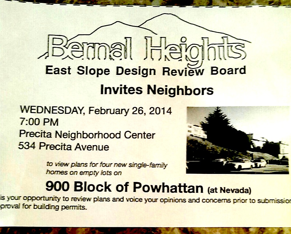 There’s a neighborhood design review board meeting set for tomorrow night, Wednesday, February 26 at 7 pm at the Precita Neighborhood Center, to discuss a proposal to construct four single-family homes on the undeveloped “triangle” of land at Powhattan and Bernal Heights Boulevard.