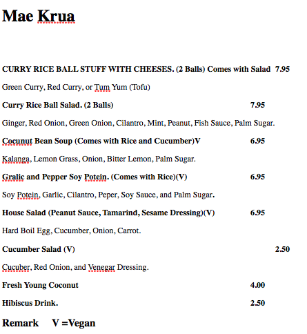 I was going to make the same snarky comment but you beat me to it! All that’s missing for the authentic Thai menu is some “french fried” to placate the farang. The cheese balls are a surprise. Aroy mak mak!