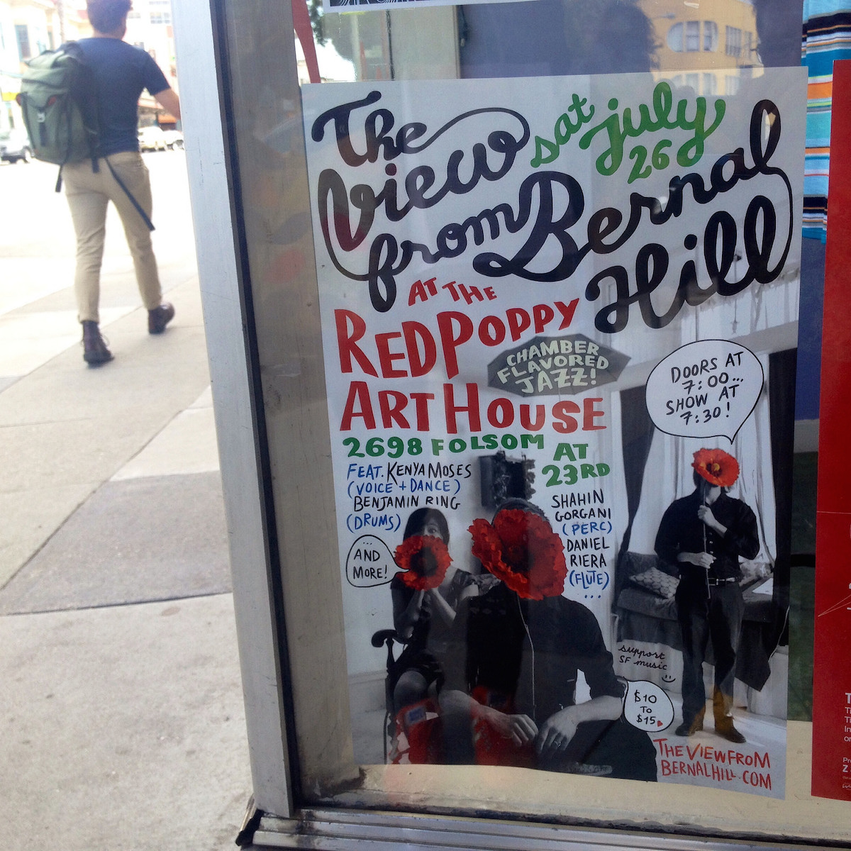Anyway, The View from Bernal Hill will perform at 7:30 pm on Saturday, July 26 at the Red Poppy Art House (2698 Folsom at 23rd) — which also is not in Bernal Heights, although it is, admittedly, sort of nearby.
