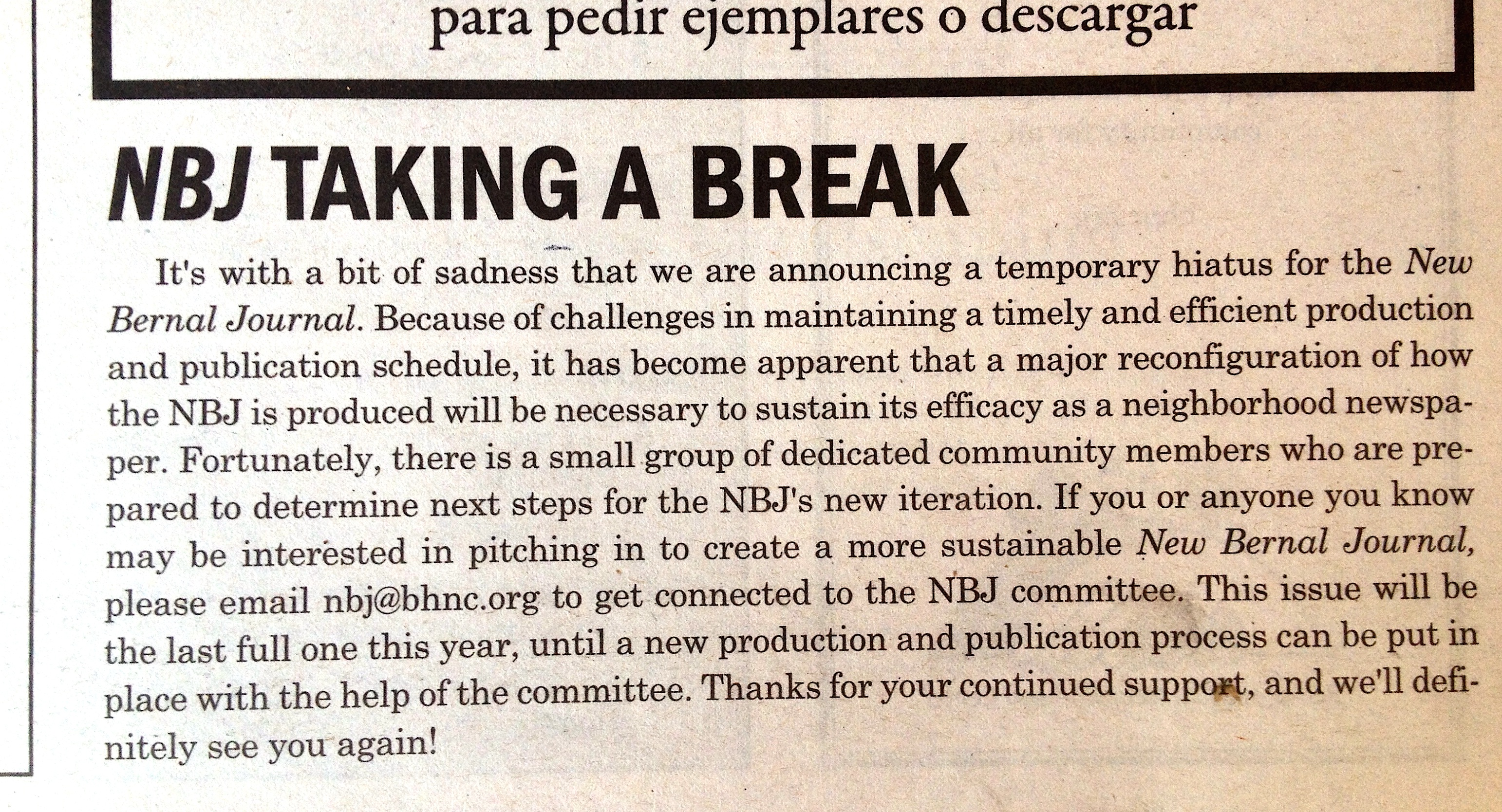 Bernalwood reached out to BHNC executive director Rachel Ebora for insight, and she explained that producing New Bernal Journal had become difficult in its current form, and that there was a desire to make the newspaper “more community driven vs. completely staffed by BHNC.”