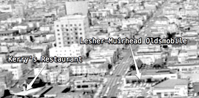 There are lots of new cars lined up outside the Lesher-Muirhead Oldsmobile dealership on the corner of Army and South Van Ness, while just a little farther west we can see the big sign for Kerry’s Restaurant — open 24 hours a day, with ample parking! — rising above Army Street.