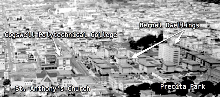 There’s Cogswell Polytechnical College, on Folsom between 26th and (then) Army Street. Just south of that, the original St. Anthony’s church still stands, before it was destroyed by fire in 1975. And of course, the infamous Bernal Dwellings housing project, built in 1952, with its fortress-like residential tower, dominates the block on Army between Folsom and Harrison.