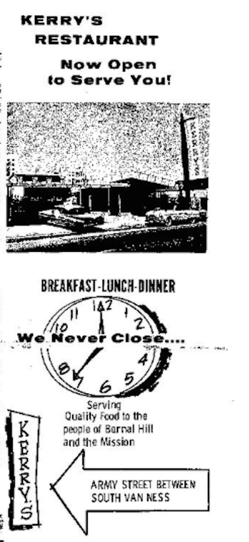 Here’s an advertisement for Kerry’s from a 1964 copy of the Bernal Heights Pictorial, which was an “antecedent to New Bernal Journal”: