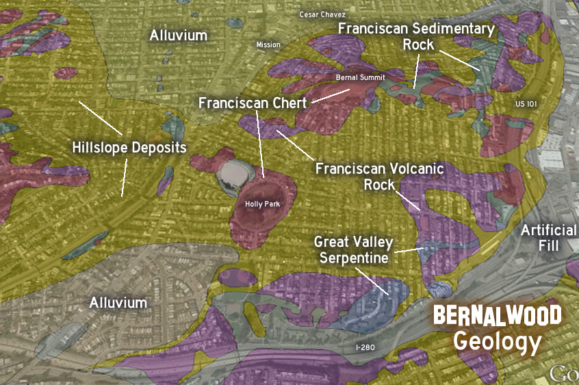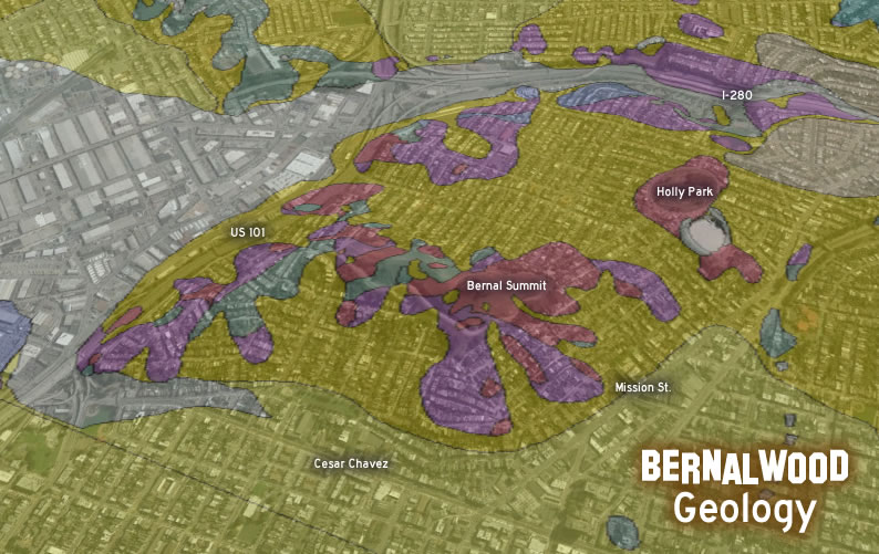 Geologically speaking, Bernalwood is actually closer to the San Andreas than downtown, but the solid chert bedrock that makes up Bernal Hill didn’t shake nearly as hard as the soft sediment and artificial fill of the Financial District, Mission, or SoMa. That same chert explains why Bernal residents often miss smaller quakes that rattle people in other parts of the City.