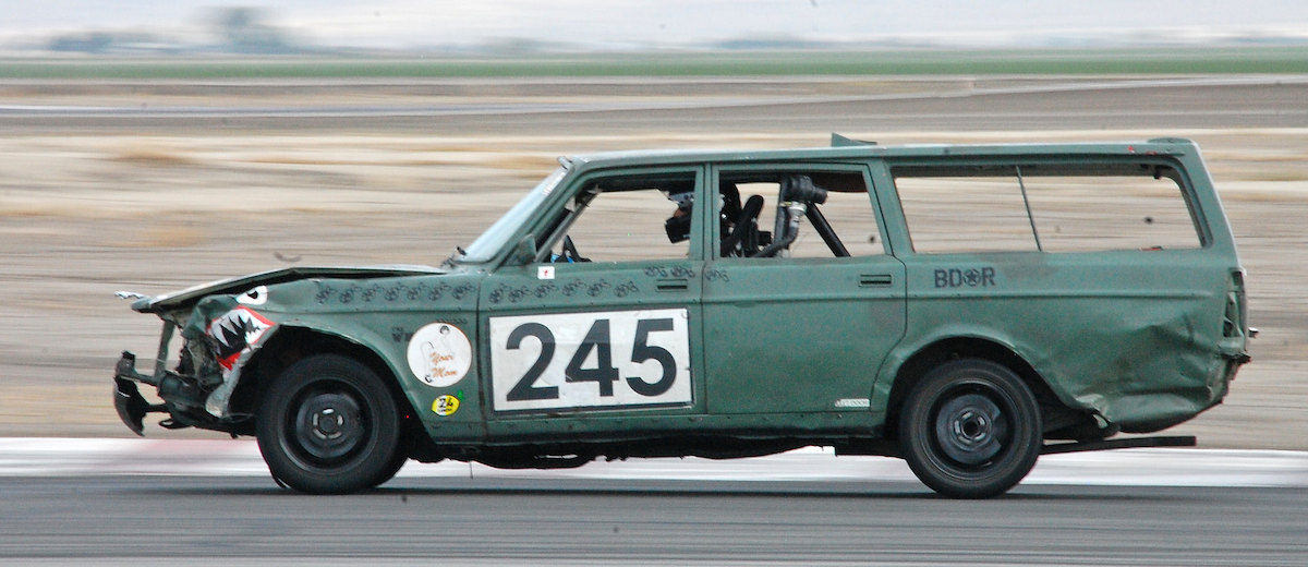 In its second race, at the notorious Altamont Speedway, an overly ambitious competitor slammed into the front wheel, bending the strut so far that the tire rubbed against it. Once a spare was sourced from another team running a Volvo, it was back on the track in 30 minutes. This pattern has been repeated many, many times since: Race, wreck, repair, race more.