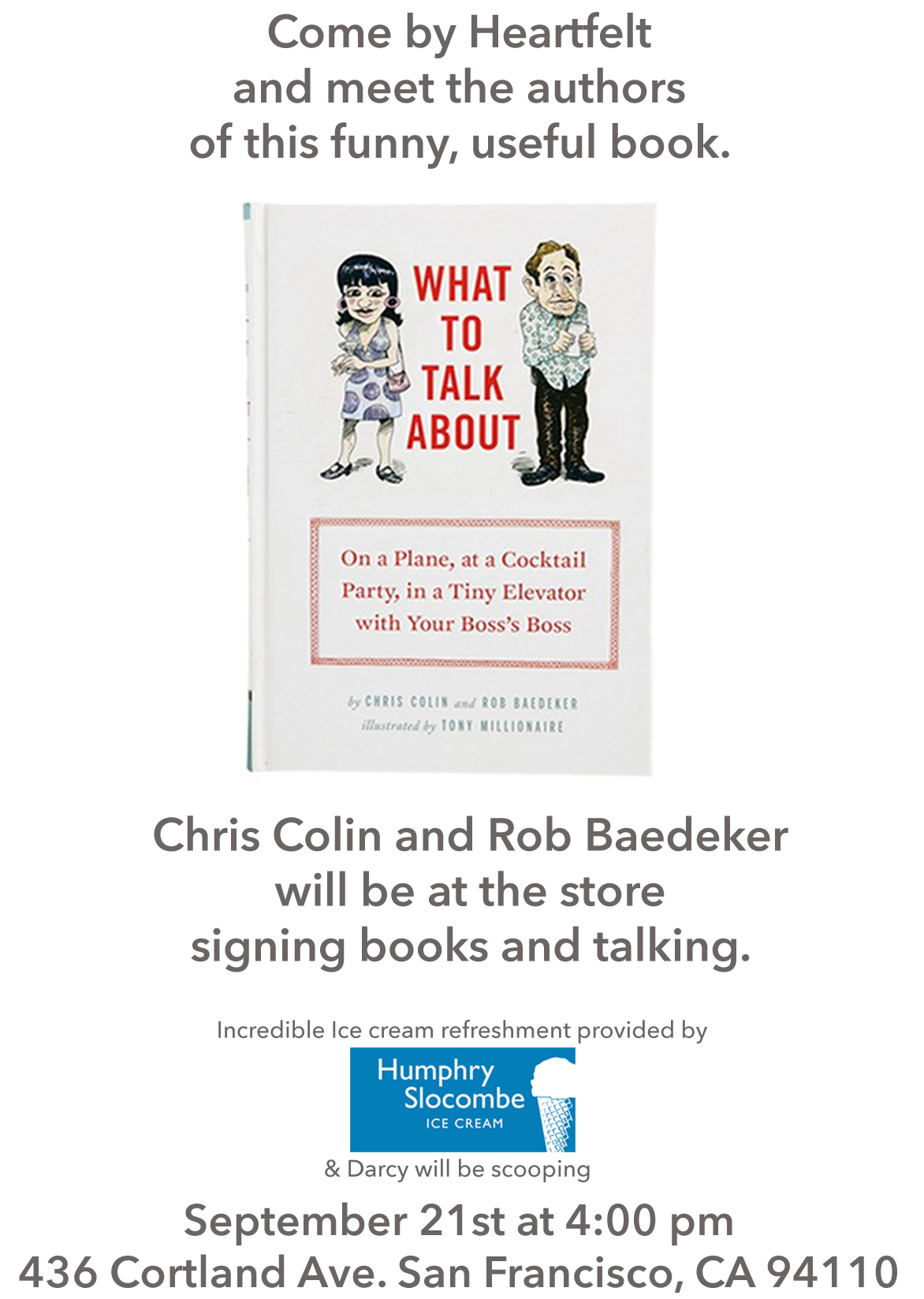 Celebrity author Chris Colin and his writing partner Rob Baedecker have written a ridiculously awesome book about the fine art of conversation that’s called “What to Talk About: On a Plane, at a Cocktail Party, in a Tiny Elevator with Your Boss’s Boss.” It’s sort of a self-help book, and sort of a comedy book, and just enough of each to make it both entertaining and useful and useful and entertaining. I’ve read it, I learned from it, it cracked me up, and I highly recommend it.