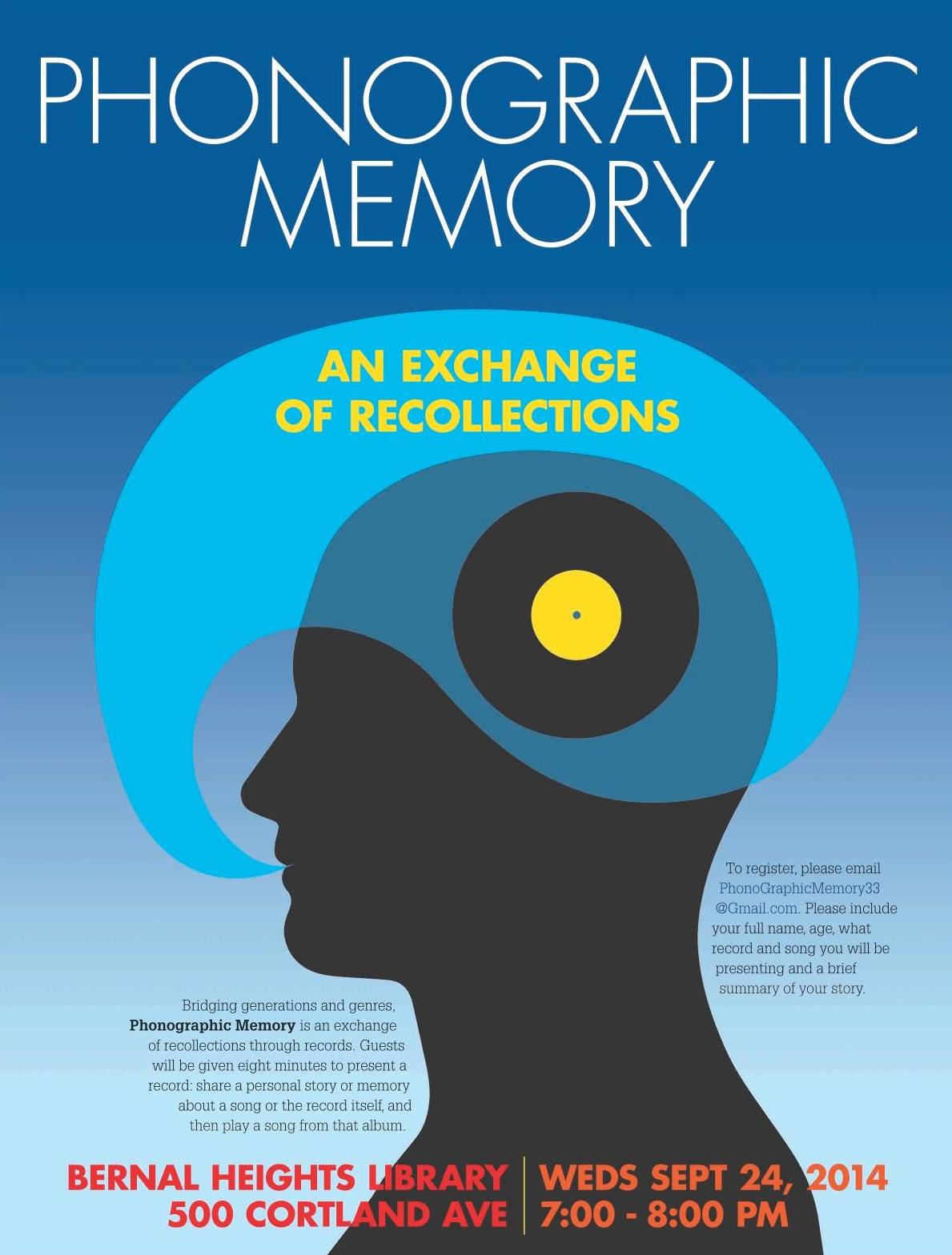 To register, please email PhonoGraphicMemory33@Gmail.com. Please include your full name, age, what record and song you will be presenting and a brief summary of your story.