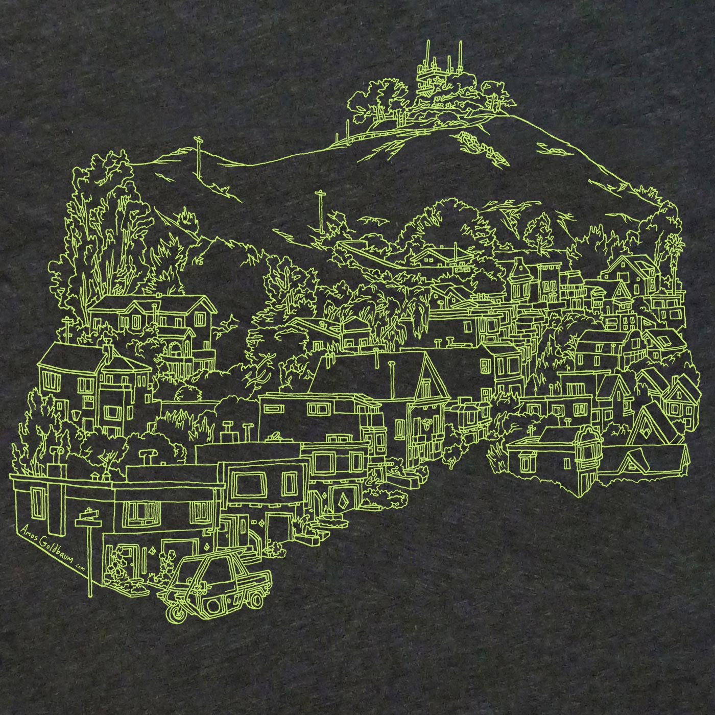 That’s where you’ll find the t-shirts with Neighbor Amos’s sexy new Bernal Heights graphic, shown above. So lovely! So detailed! So locavore!