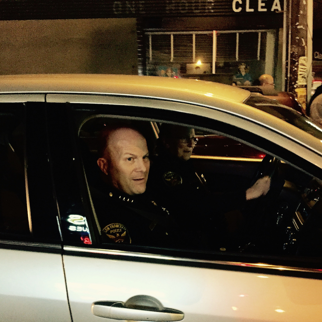 At one point, Bernalwood peered into a car stopped at the intersection. Star Sighting!!! It was San Francisco Police Chief Greg Suhr. You remember: That guy from the Batkid video! Chief Suhr was out surveying the situation from the passenger seat of an unmarked car: