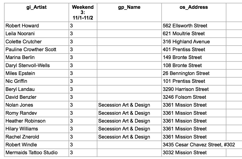 Right on. And here’s the details, to get the names and addresses of the participating Bernal artists: