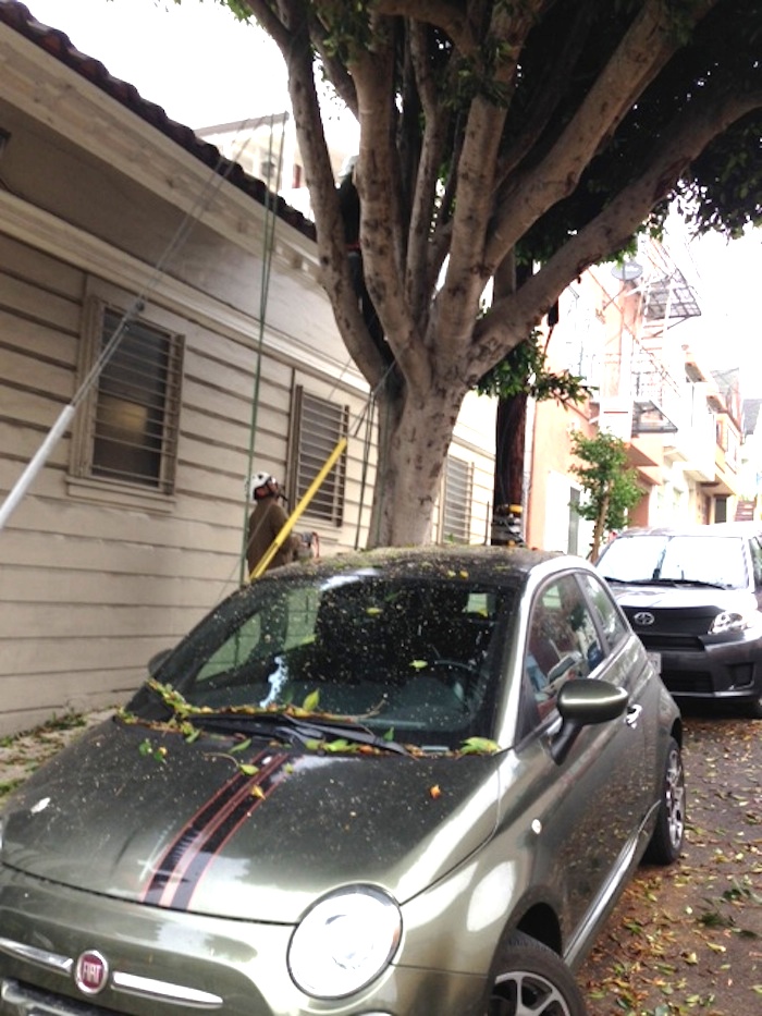 With help from a team of indifferent landscaping contractors and Sir Issac Newton’s laws of gravitation, there was an awkward interaction on Monday between a few oversize Bernal trees and a few undersize Bernal cars.