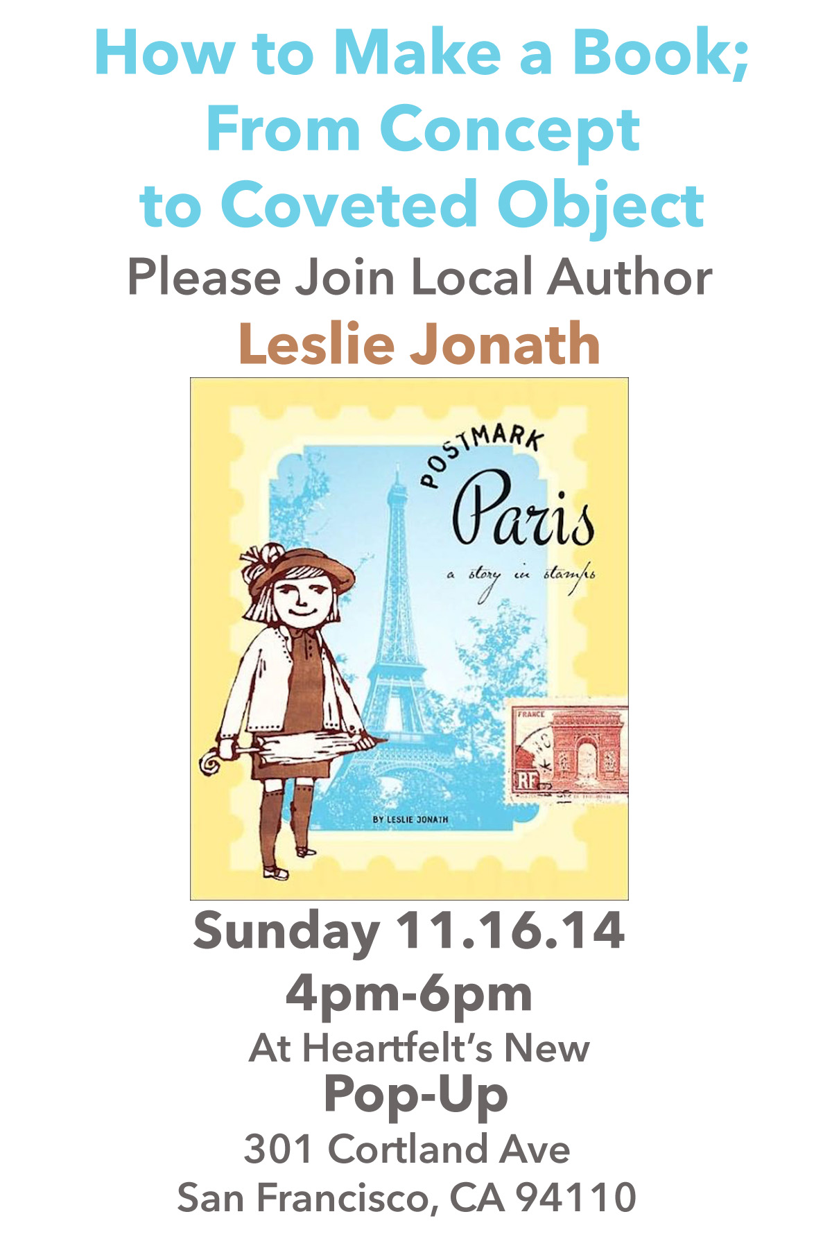 We are thrilled to announce that local author Leslie Jonath will be schooling us all on how to create a book, at Heartfelt’s newly curated Pop-Up location.