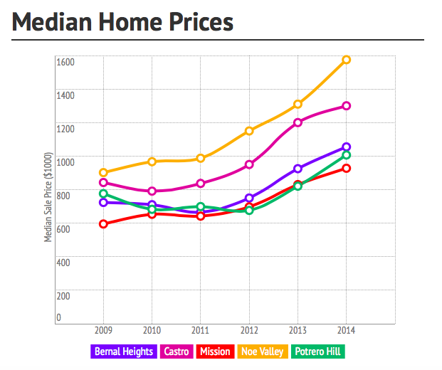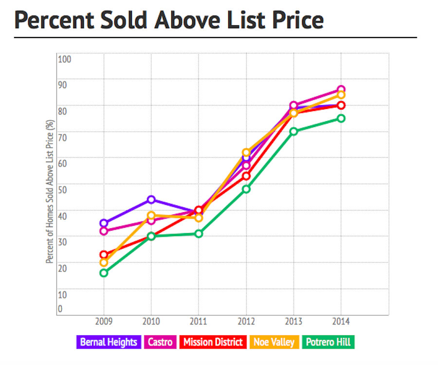 Bernal Heights: Up 57% since market bottom; up 24% from its previous market peak in 2007. Bernal Heights has become one of the most popular, more affordable, go-to neighborhoods for house buyers who like the neighborhood ambiance of the general Noe Valley area, but were priced out there by its rocketing prices. Bernal Heights’ houses – with a median price about 45% lower than Noe Valley’s – have looked likeextremely good values in comparison. Buyer competition for new listings became particularly fierce in the past year or so.