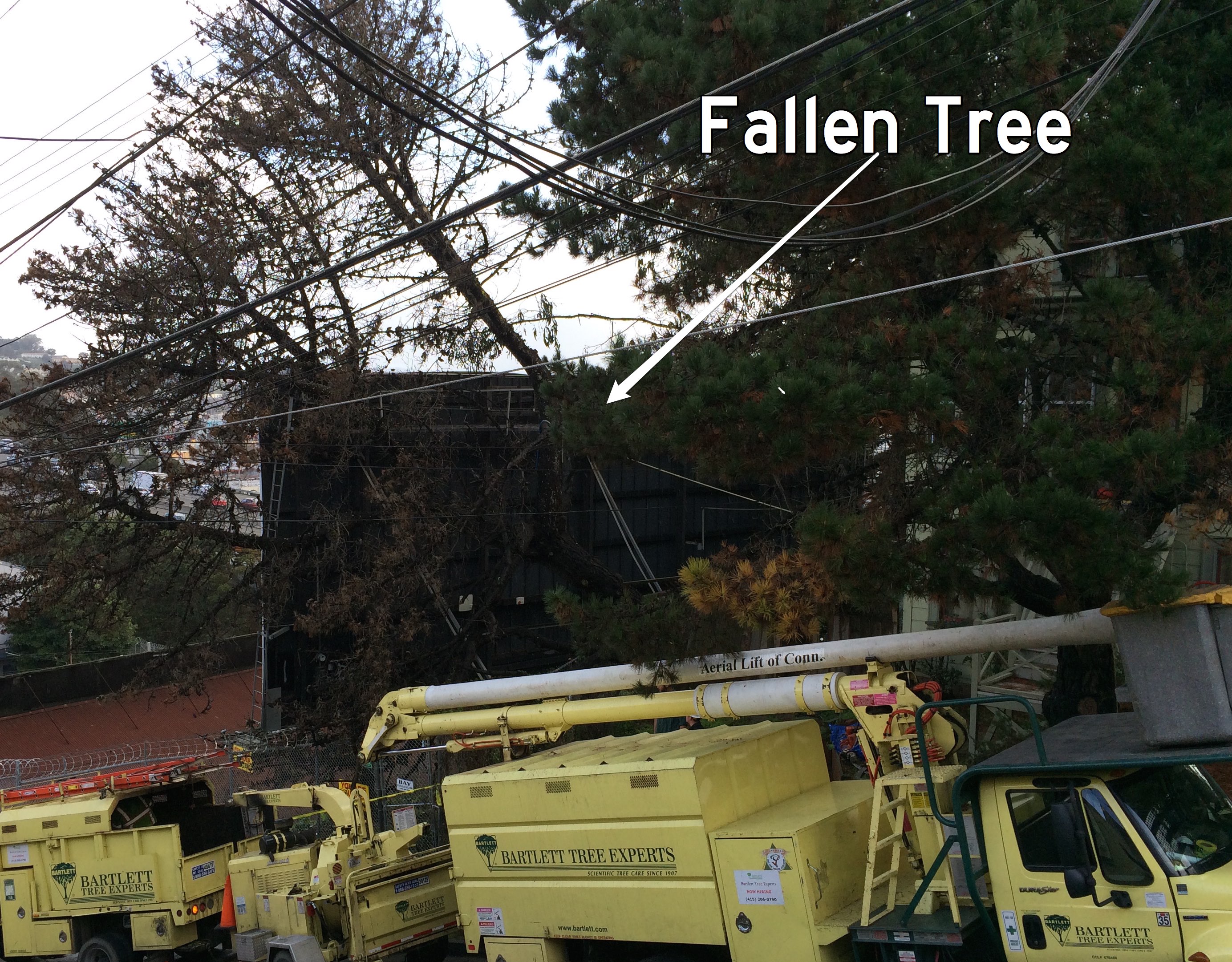 Well, yesterday the tree fell down, but the fall was arrested by the Apple billboard, preventing more serious damage to the structures below. Neighbor Darcy was on the scene, and she filed an immediate report from her, uh, iPhone: