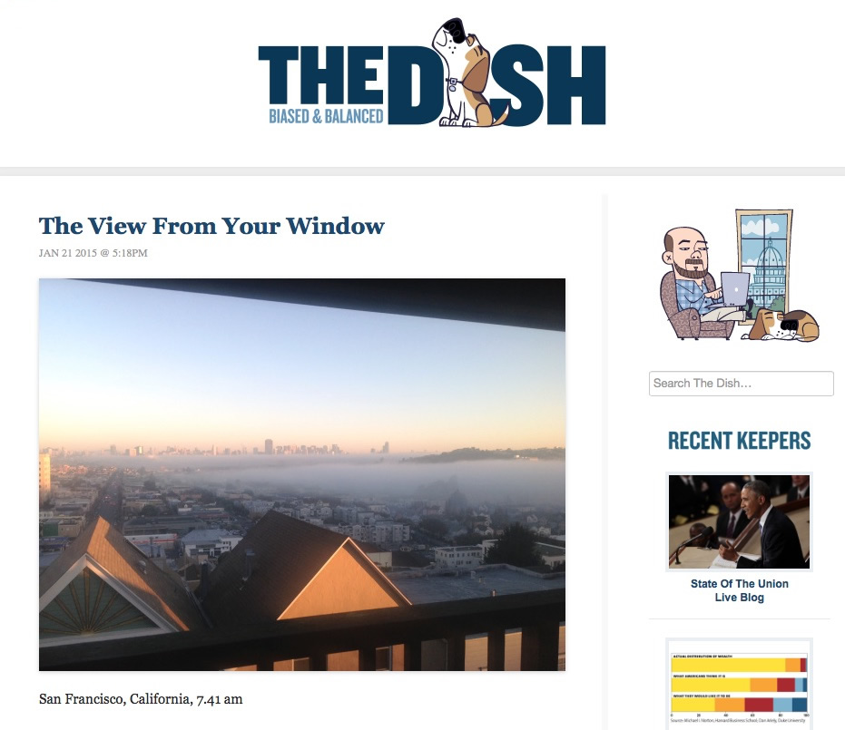 Famous ur-blogger Andrew Sullivan has a recurring feature on his famous blog, which he calls “The View From Your Window.” That’s where readers of the blog share beautiful pictures taken from windows all over the world.