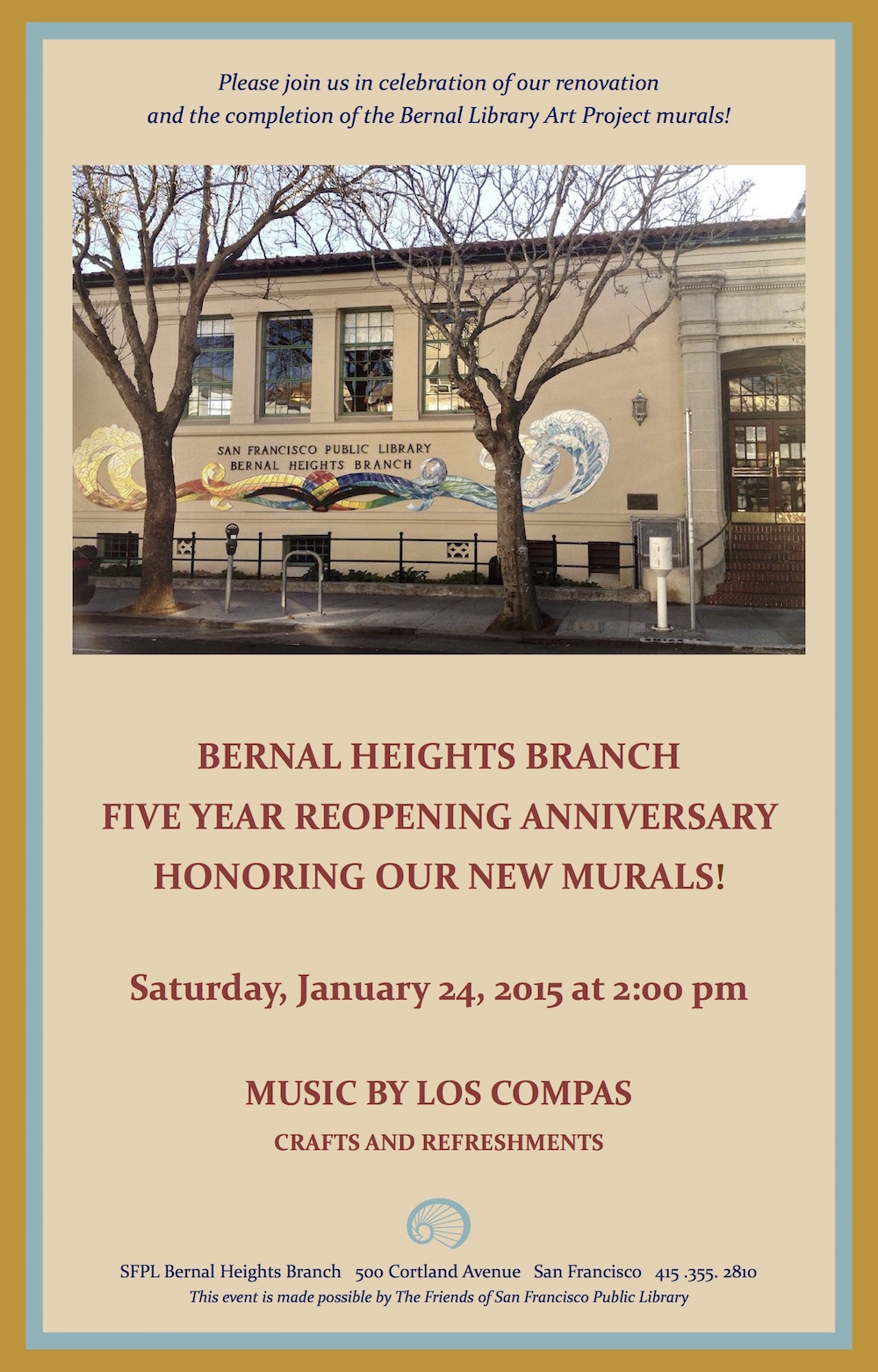 So let’s celebrate! The Bernal Heights Branch is having a 5th Anniversary bash on Saturday, January 24, 2015 from 2 – 4 pm, and you’re on the guest list: