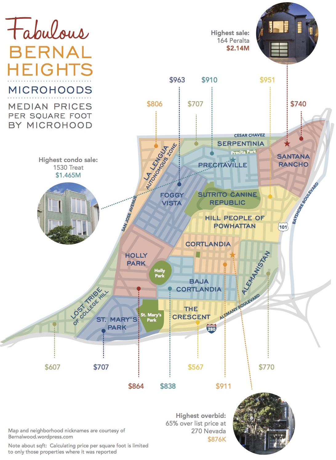 The median sales price for a house was $1.16M this year.Your intrepid real estate agents and data junkies analyzed the Bernal market using the infamous Bernalwood Microhood map as a way to further understand the market. Microhood names and designations are courtesy of our friends at Bernalwood.