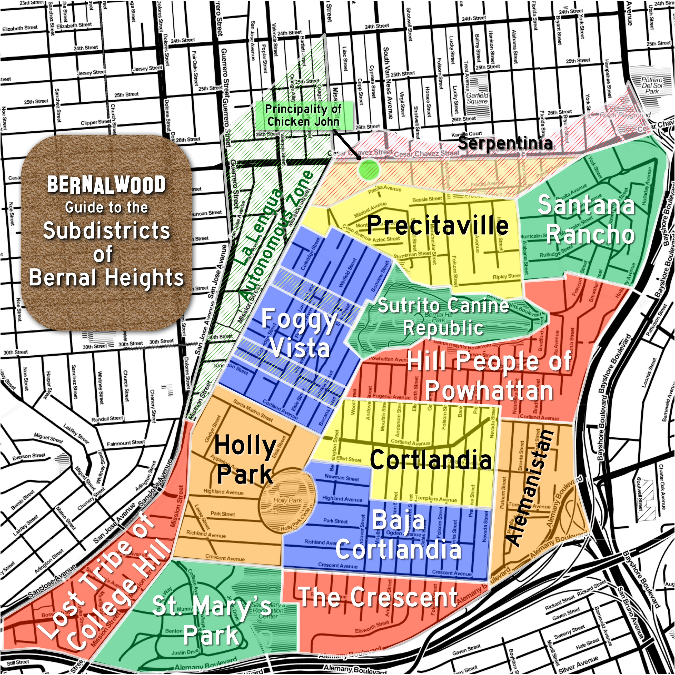 As you no doubt recall, Bernalwood’s 2014 Official Guide to the Subdistricts of Bernal Heights (shown above) was created to map the cultural and topographical geography of our neighborhood in a way that’s both tongue-in-cheek and also kind of somehow vaguely true. What you may not recall, however, is that the Official Subdistricts were specifically created as a playful response to a realtor who had attempted to create her own (less homegrown) sub-map of Bernal Heights.