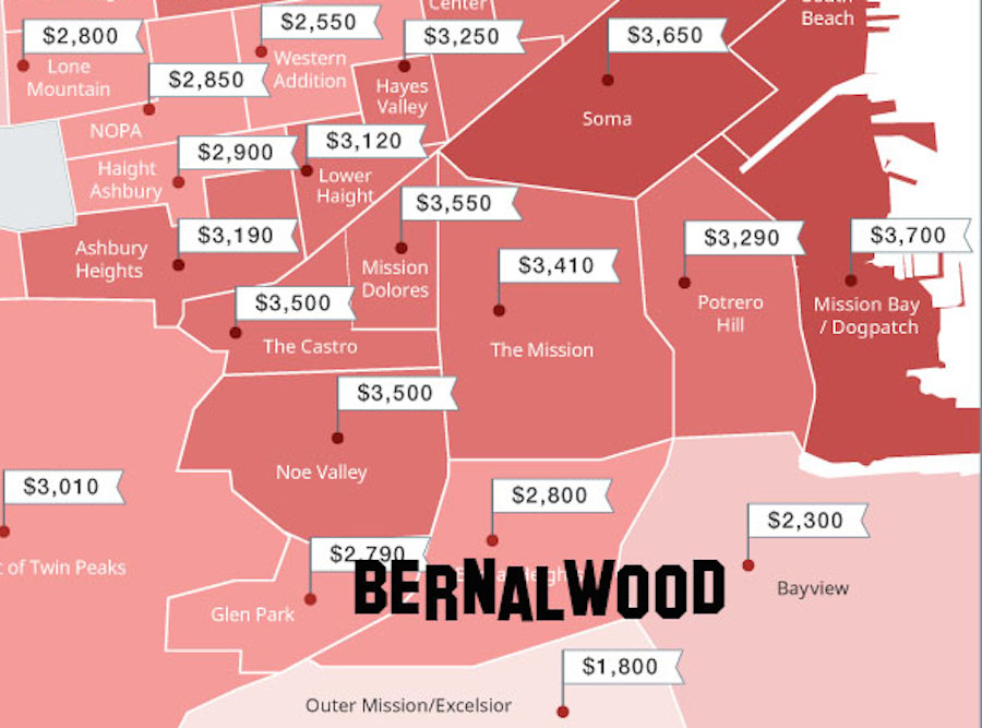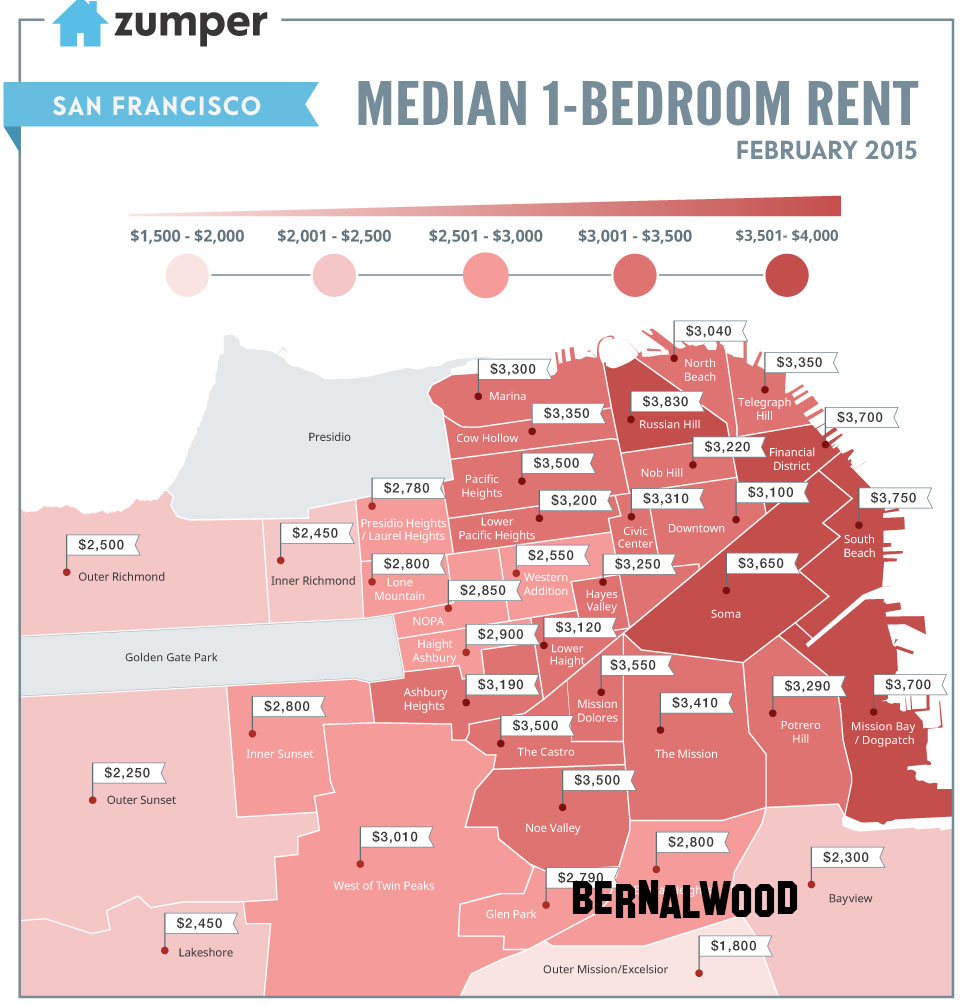 Time for a quick check-in on the state of Bernal Heights apartment rentals. The data geeks at Zumper just pulled together an overview of 1-bedroom apartment rental costs across town. Citywide, the rent is too damn high: