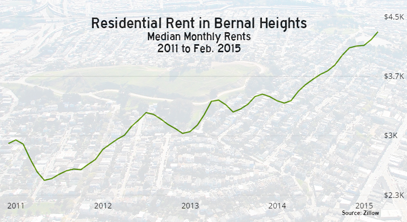 But what about Bernal Heights? For insight on our hyperlocal rental market, the data geeks at Zillow offered to crunch some numbers for us. Bottom line: The rent is too damn high! Median rents in Bernal are even higher than in San Francisco overall, having climbed by 24% in the last year alone. Oof. Zillow’s Tali Wee sent us this summary: