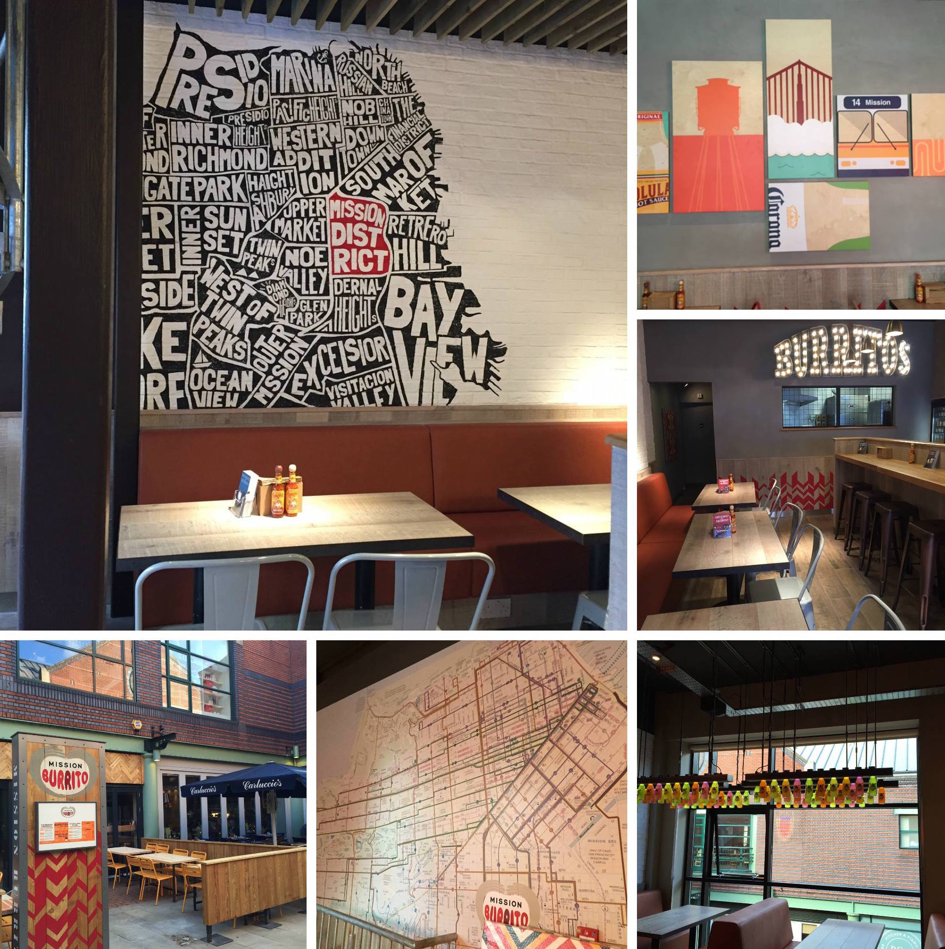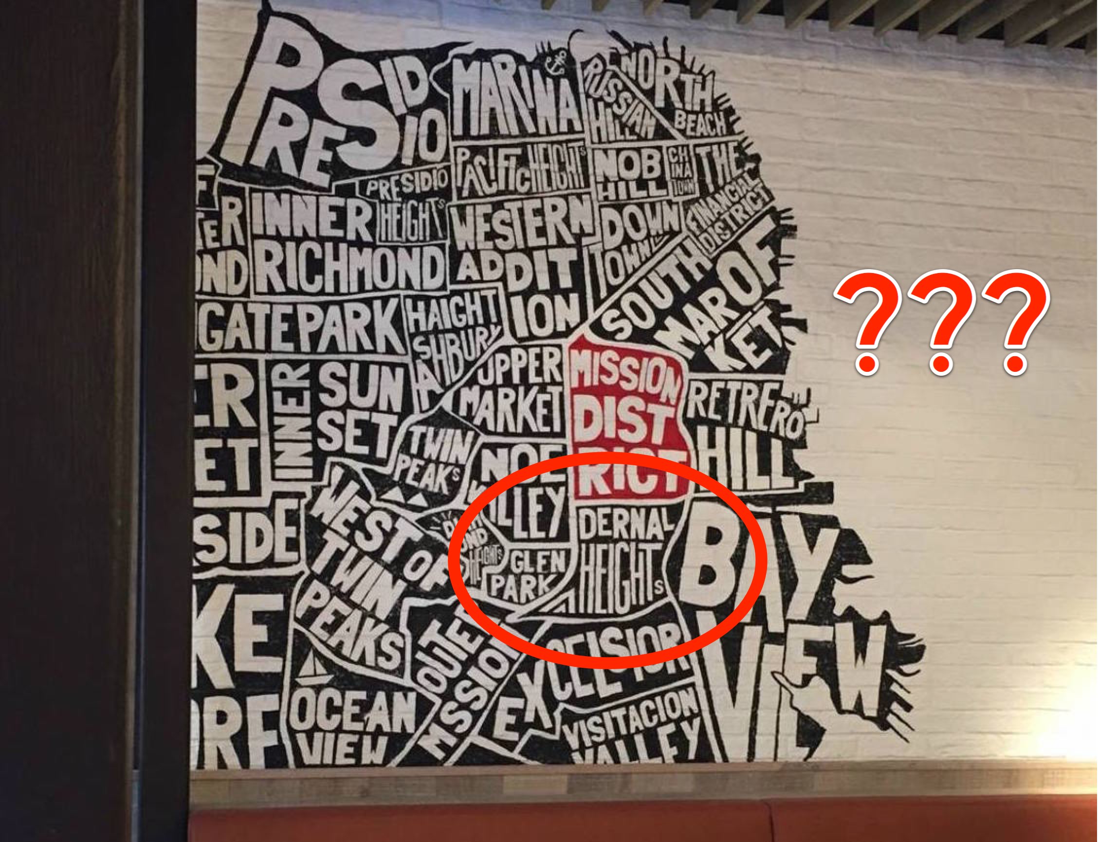 We can’t say much about the quality of the burritos from Mission Burrito (especially after so much long-distance travel), but we did notice a nontrivial problem with the big map of San Francisco painted on the wall of the new Brindleyplace location. Look just south of the Mission District on the wall map shown in this Brindleyplace store photo-montage, and you’ll see a shape that accurately replicates the outline of our own neighborhood.