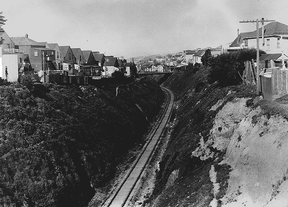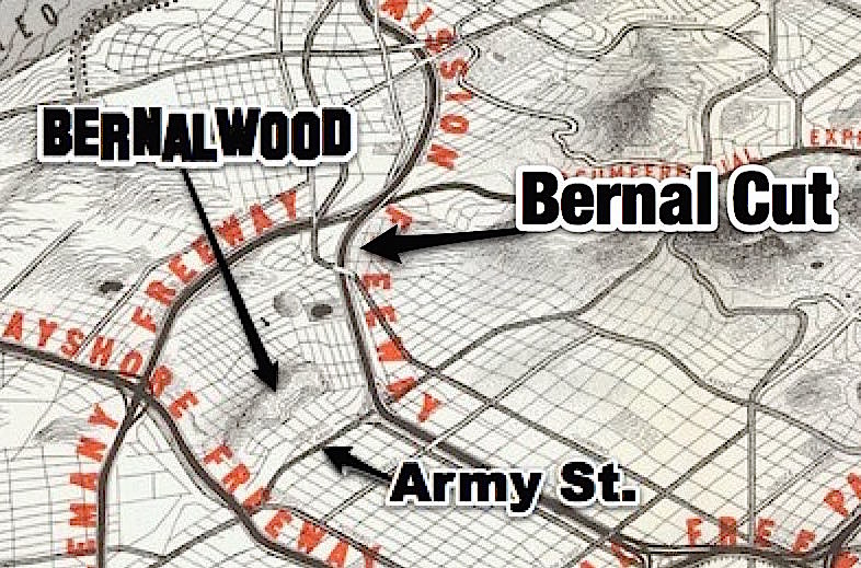 The void that divides Bernal from Glen Park today is called the Bernal Cut, and it now carries a streetcar line and auto traffic that speeds along San Jose Avenue to and from I-280. It is very unlovely: