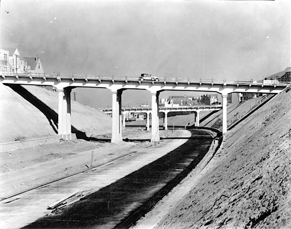 Then came the age of the automobile, and in the late 1920s, the cut was widened and expanded to create an arterial road into San Francisco’s urban core. Here’s another north-facing view, this time from 1929, when the construction of the roadway was almost complete: