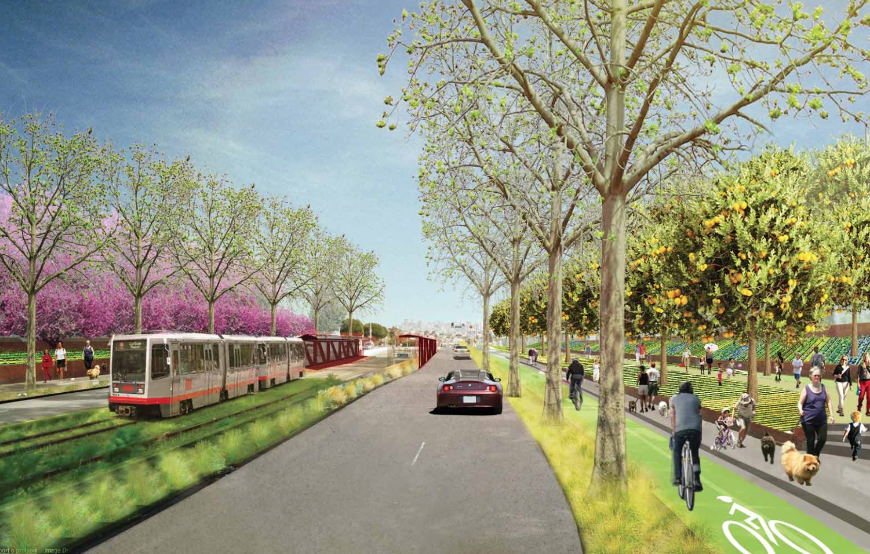 The only trouble is that the Bernal Cut Farms rendering shows levels of pedestrian density that are higher than even Mission Street typically gets, and orders of magnitude higher than on any street that has nothing fronting on it. To get anywhere close to that level of activity, the street will have to be lined with businesses, which is not likely with so little width available to be reclaimed from traffic lanes.