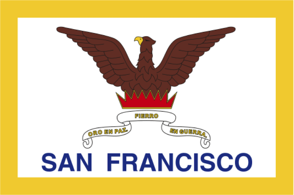 The crux of his TED Talk was that the flags of American cities are generally rather terrible, and San Francisco is a clear case in point. Very few people are familiar with San Francisco’s flag, because San Francisco’s flag is a hot steaming mess that breaks all the rules of vexillological good taste. It looks like this: