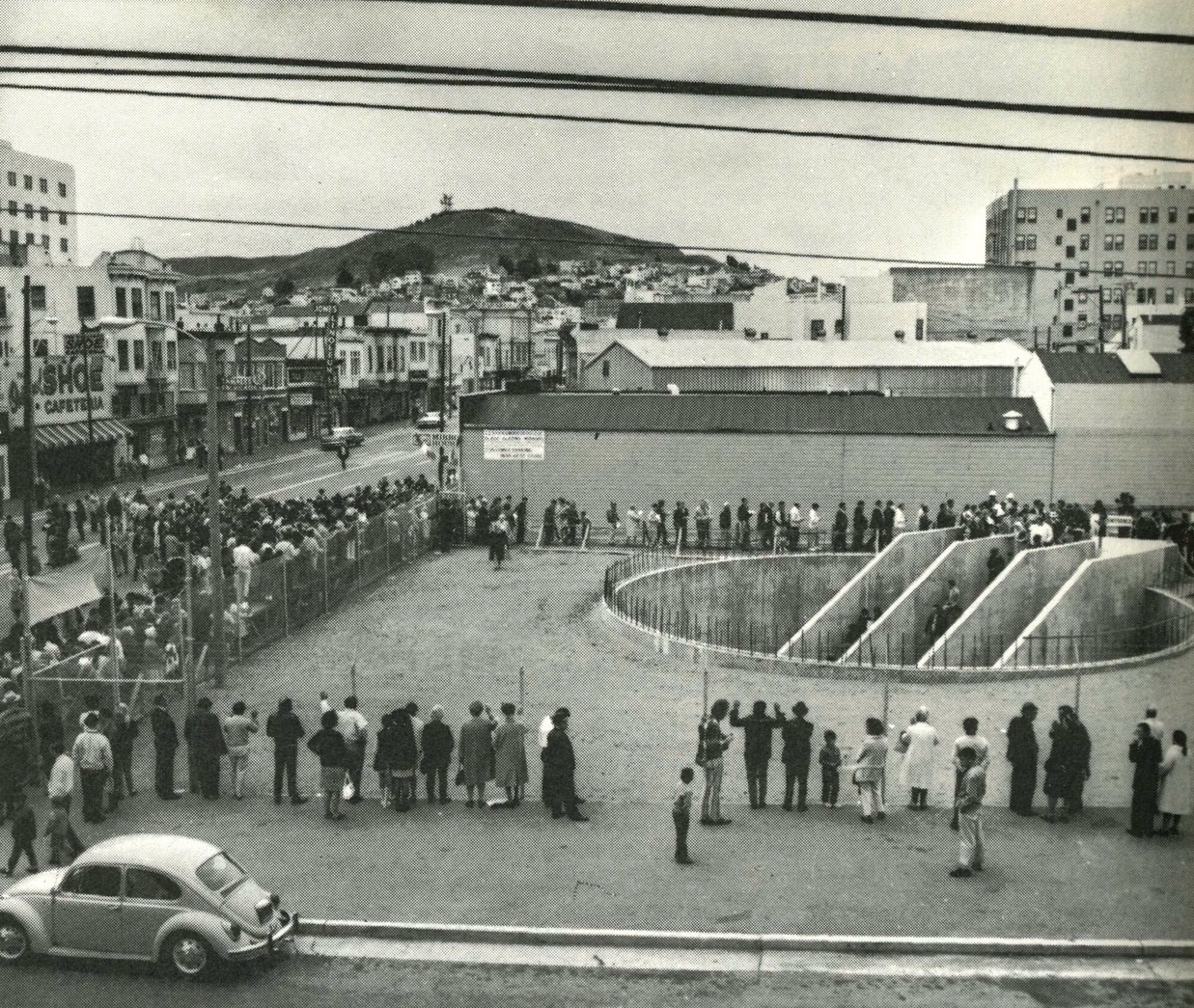 The scene in today’s photo is a special day in August, 1970 when Mission District neighbors were invited to take a sneak peek at the just-completed, but not-yet-open 24th Street BART station. The long lines reflect the intense curiosity that surrounded the opening of BART after many unpleasant years of cut-and-cover construction chaos and disruption along Mission Street.
