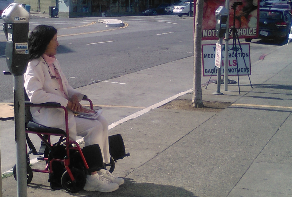 Thank you for publishing this account for many reasons. The story demonstrates the many problems with the tolerance for the ongoing protesters outside the Planned Parenthood Clinic. The vulgar and distorted disrespect for women is an offense to the grand majority of people who encounter them. The aggression and intrusion of privacy is beyond the issue of a woman’s right to make her own health and intimate choices. The constitutional shield is a strange rational for accepting harassment and in extreme cases murdering doctors who provide abortions. It has been suggested that in our neighborhood we should be able to recruit enough powerful men and women to form a protection line and ridicule the protestors away in shame. Recently a large billboard a few hundred yards away displays a smiling young mother saying “you can change your mind after taking the anti abortion pill. I did.” Waiting for a bus near Iglesia del Mundo it is easy to watch the protestors who occasionally leave their posts and walk to the other corner of the Valencia-Mission fork that homes another neighborhood pariah – the gun store.