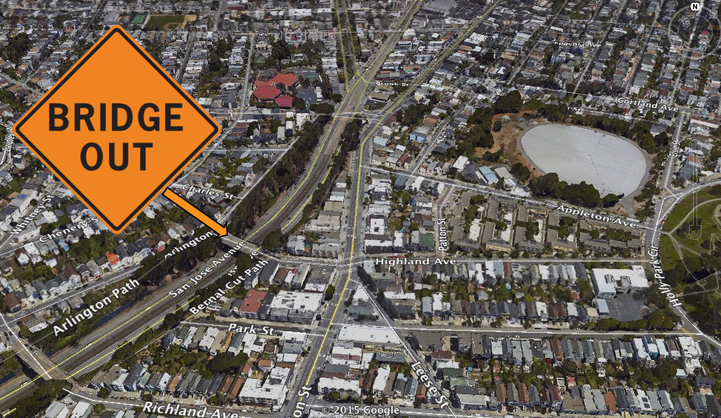 The Highland Avenue bridge has been completely closed off for the foreseeable future … so please plan or alter routes accordingly. No vehicular OR pedestrian thru-traffic between Mission and Arlington at this time. The Bernal Cut Path, of course, remains open, and you can cross Highland, you just can’t get to Arlington. Should be a nice little nightmare for those of us in the immediate area!