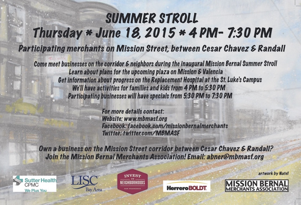 Don’t miss this Thursday’s Mission Bernal Merchants Association SUMMER STROLL! Look for food specials, art events and other fun activities up and down the street. Participating businesses include Ichi Sushi, BEL, Secession Art and Design, The Blue Plate SF, Iron & Gold, Virgil’s Sea Room, The Front Porch, Cafe St. Jorge, The Rock Bar, Cole Hardware, The Knockout and more!