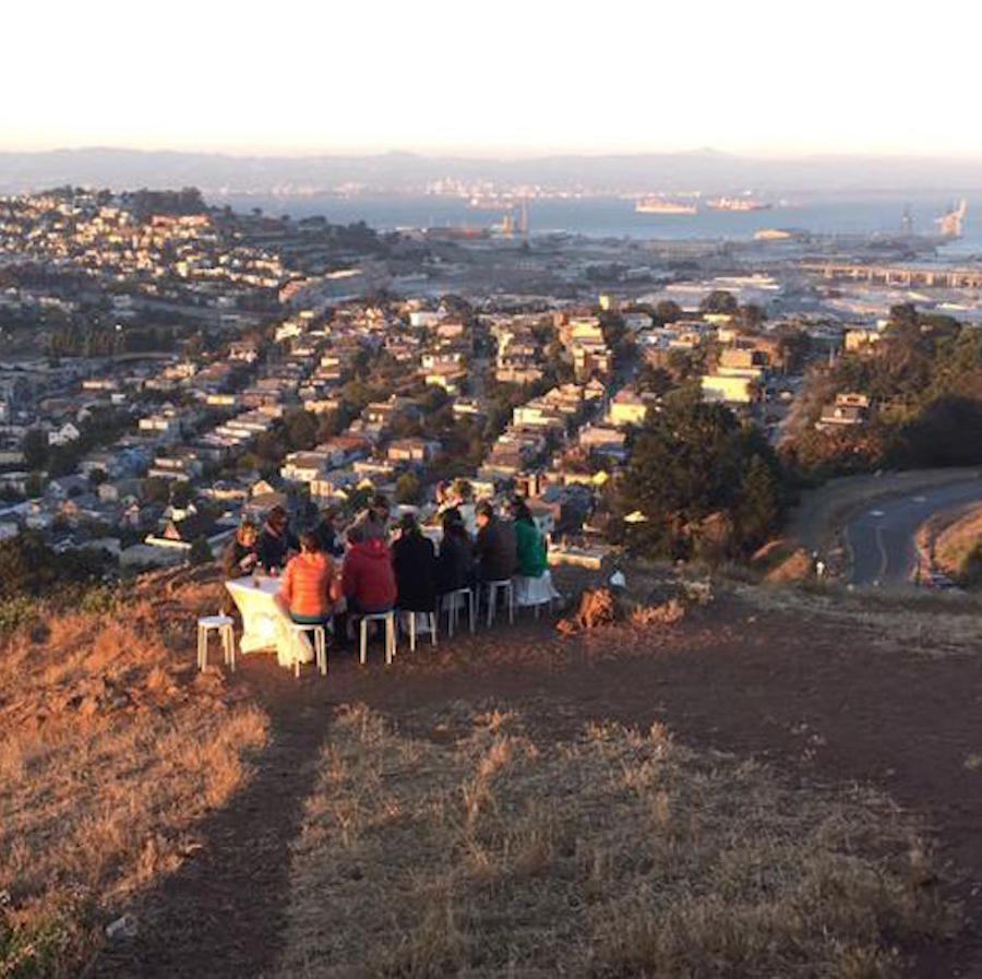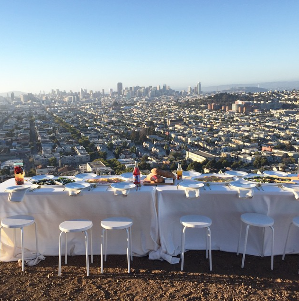 Last night, on the evening of the solstice, a group of very resourceful, very tasteful friends hosted a proper dinner party on Bernal Hill, complete with white tablecloths, linen napkins, and porcelain plates.