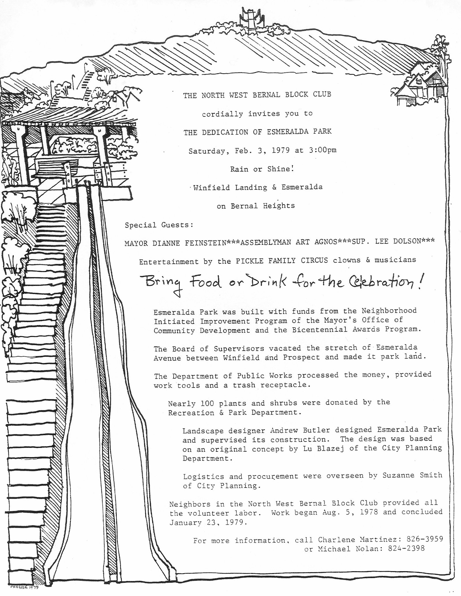 As a historical reminder, this announcement from 1979 tells us much about the community origins of the Winfield Mini-Park, and how the City once paired with Bernal neighbors to help make the park so lovely. Let’s hope that can happen again: