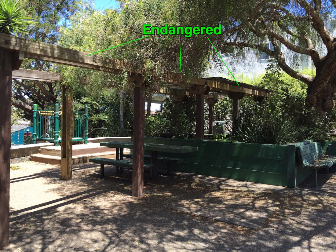 Now the trellis is slated to be removed within a week! The planter box surrounding the big pepper tree is also due to be removed, timeline unknown. The remaining picnic table and benches haven’t been mentioned as part of the takedown, but they have rot as well.