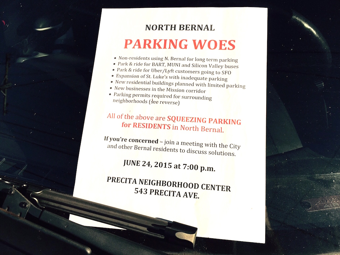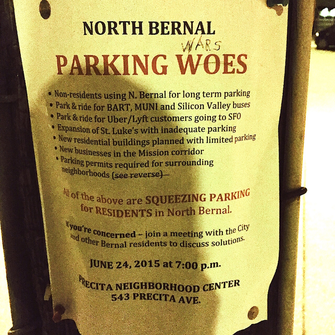 Apart from the usual tempo of passive aggressive parking note gems, the Bernalwood Public Sentiment Tracking System has not detected much recent change in the intensity of conversation about street parking — other than to say that the conversation is always somewhat intense. But beneath the surface, tensions have come to a boil. According to a new handbill circulating in North Bernal, the parkopalypse is here, and the time for an Urgent Conversation About Street Parking is now.